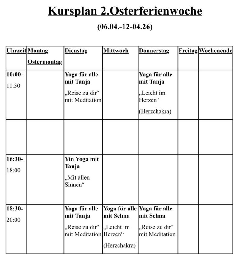 Dafür wird es in der zweiten Woche ein kleines Ferienprogramm mit ausgewählten Yogastunden geben.